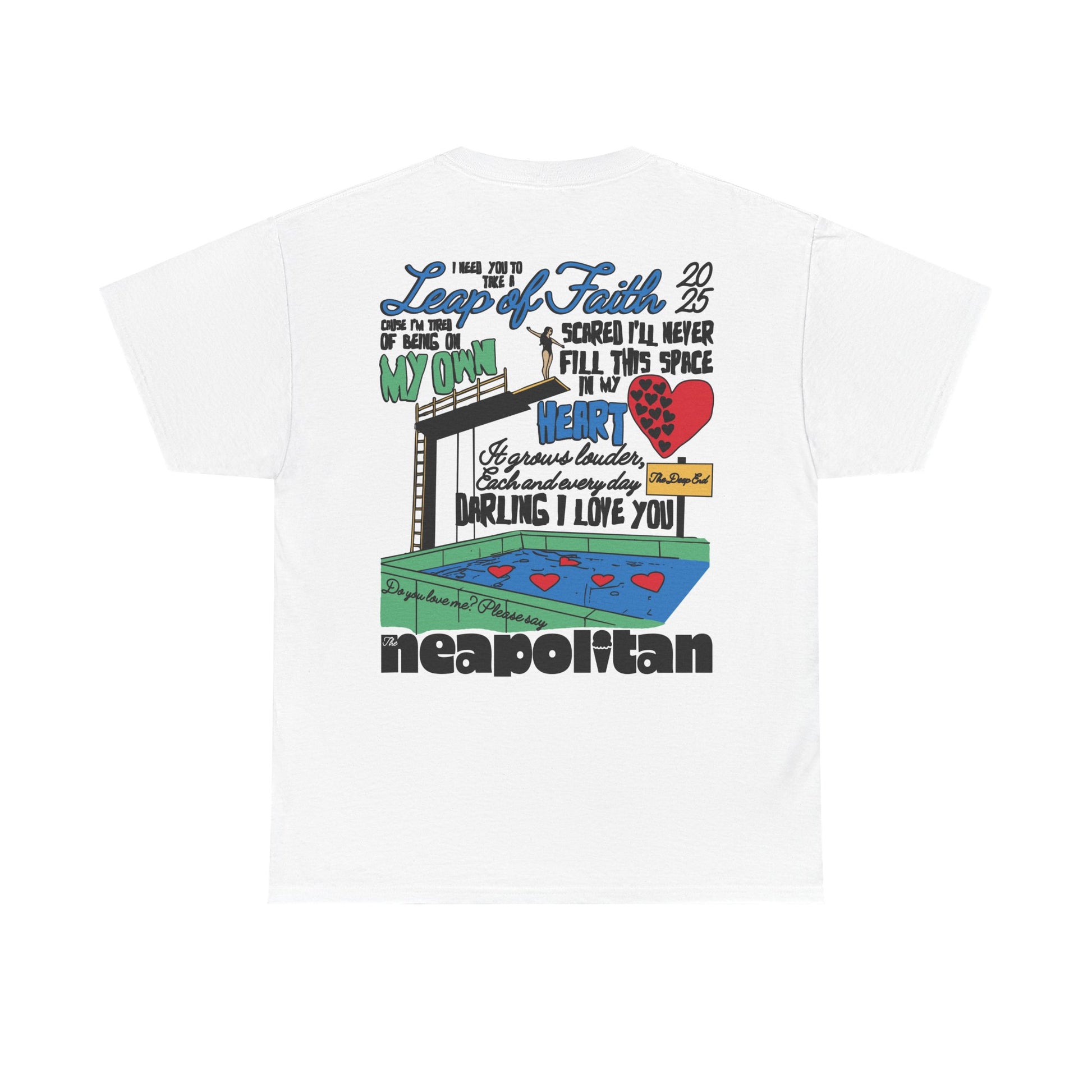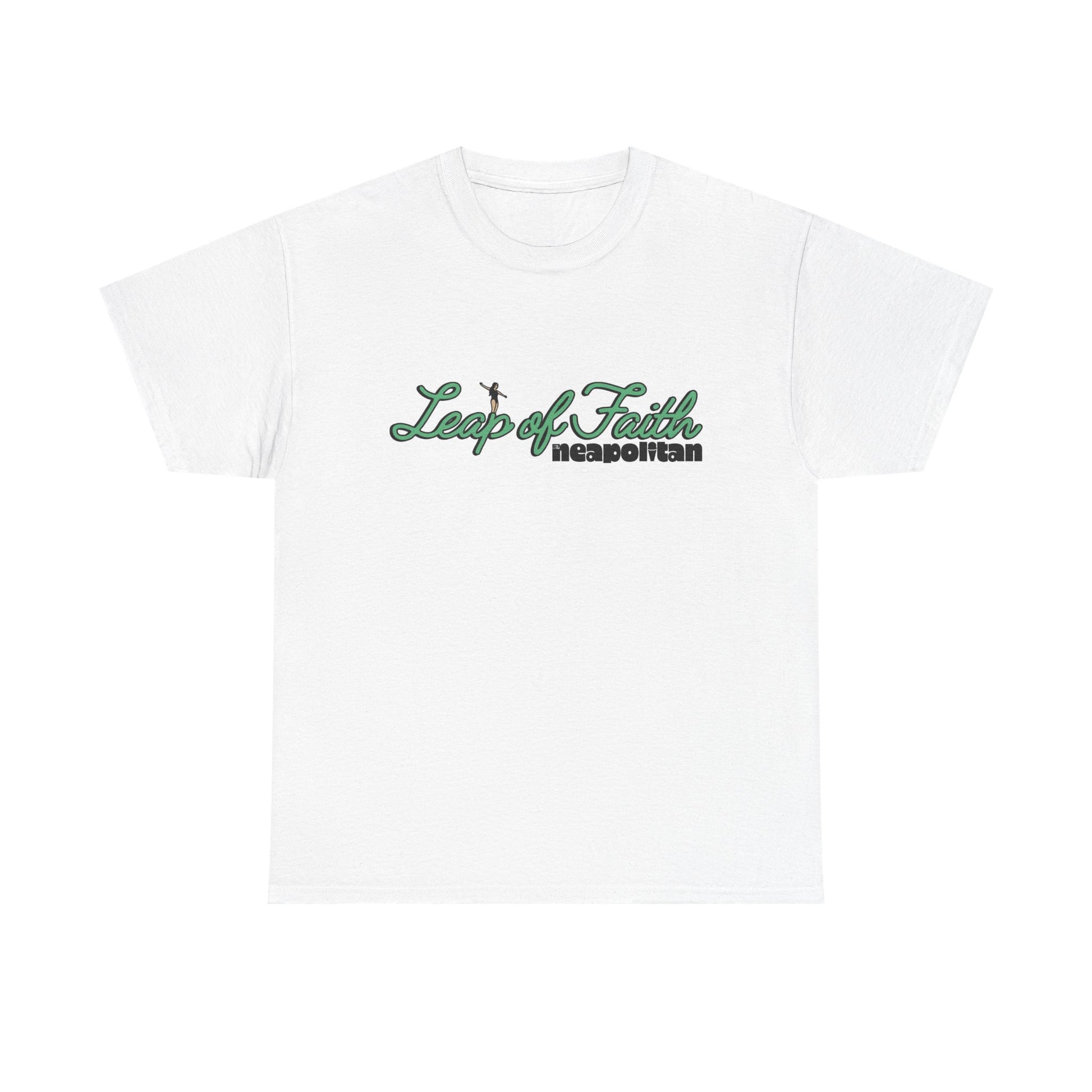 Take the plunge in style with our exclusive “Leap of Faith” graphic tee — inspired by our bold new single. This shirt captures the spirit of the track: daring, electric, and full of motion. The front features a dynamic graphic of a silhouetted figure dancing on the words "leap of faith" — echoing the song’s themes of risk, renewal, and chasing what sets your soul on fire. On the back, lyrics from the chorus are printed in handwritten script: — The Neapolitan
